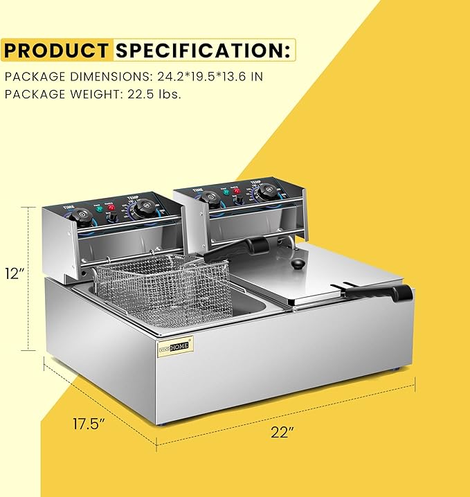 - LARGE CAPACITY - You can fry different foods at different temperatures and specific times due to the dual deep fryer which is super convenient and effective; The total max capacity is 20.7QT/19.6L(10.35QT/9.8L for each basin) and the fryer baskets capacity are 12.7QT/ 12L(6.35QT/6L for each fryer basket); The recommended oil capacity up to 12.7QT/12L(6.35QT/6L for each tank); For safety, please do not fill the basket more than halfway