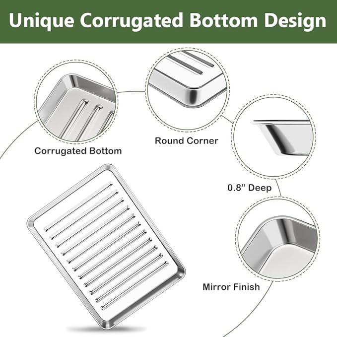 - 【Corrugated Surface】 Unique design with corrugated surface in the bottom of sheet pan, to reduce the risk of food sticking, facilitates air flow for quick release and even baking. This design also strengthen the structure to the pan for warp resistance.