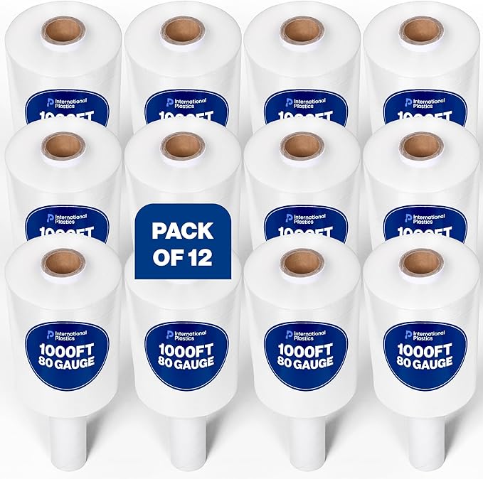 International Plastics Co. 12 Pack of 5" Plastic Stretch Film Wrap with Handles 1000 feet Each 500% Stretch Ability
