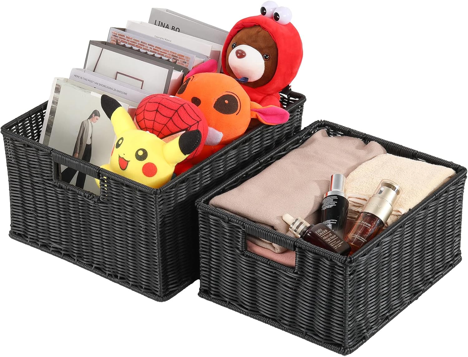 HOONEX Large Wicker Baskets for Storage, Plastic Baskets for Organizing with Dual Handles, Woven Baskets for Storage, Set of 2, (Black, 15 x 12.8 x 7.5 inches)