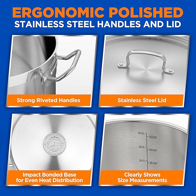 - 30 QUART STOCKPOT: With a 30 quart maximum capacity, this stainless steel stockpot is of proper size and weight for large crowds. It also features a stainless steel lid and strong riveted handles allowing you to cook with ease and conveniece