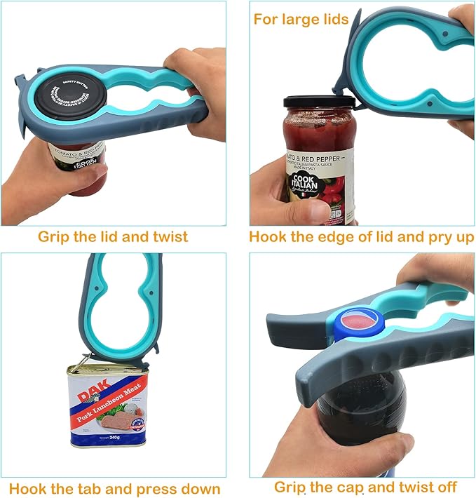 - 5 IN 1 Jar Opener and Bottle Opener.Can open lips for the bean cans, covers of the pickle bottles & caps of the sodas & soft drinks. Easily twist off screw caps with a simple twist. Clamp down on food seals to instantly remove pull tabs, no more breaking nails trying to peel the lids off of any canned food.