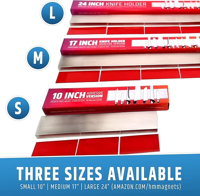 - 3 SIZES AVAILABLE: Our no-drill magnetic knife holders come in 10”, 17”, and 24” sizes. Fridge-only versions are available in 12”, 17”, and 22” sizes. Caution: Adhesive strips may not adhere to all surfaces, such as uneven tiles. Use with caution.