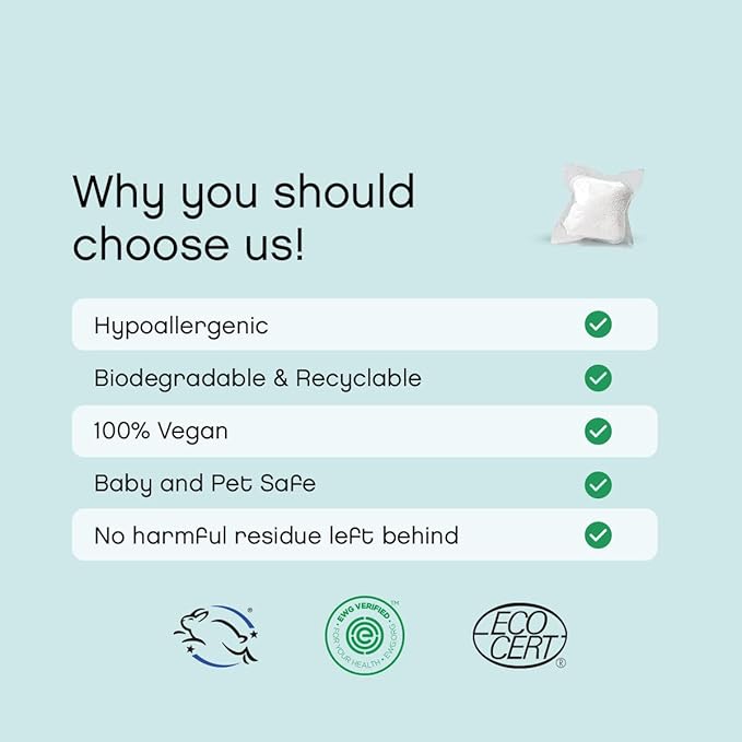 - No harsh chemicals: Our dishwasher detergent pods are effective at breaking down food residue & fighting grease but still are baby-safe and pet-safe, vegan and cruelty-free. They are certified by EcoCert.