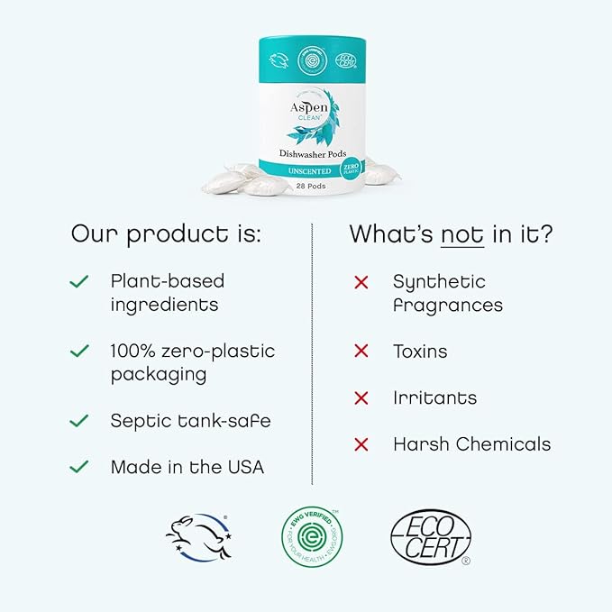 - Zero plastic: Our unscented natural dishwasher pods are made of biodegradable, plant based ingredients that leave your dishes sparkling clean every time. hey are packaged in a 100% recycled paper container with NO plastic, while being fully compostable.