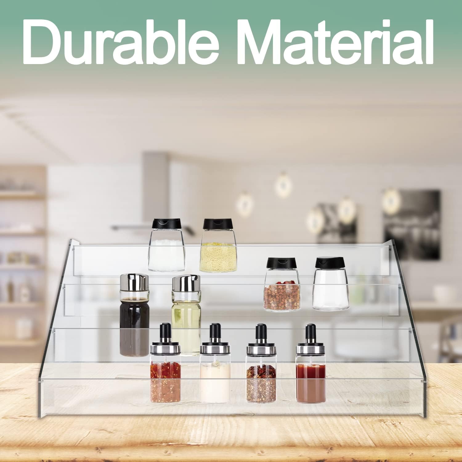 - DURABLE MATERIAL:The seasoning organizer is made of high-quality acrylic material, and countertop spice rack is sturdy and durable with a smooth and flat surface. Pantry organization and storage can be easily cleaned with a damp cloth.