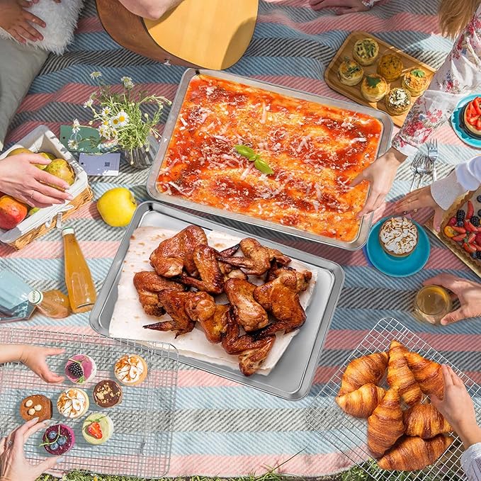 - 【NON-TOXIC & DURABLE】P&P CHEF half sheet and rack set is made of premium pure stainless steel without any chemical coating or other material, Neither releasing toxic material to food, nor reacting with your meal, Heavy-duty structure can hold heavier food and will be durable for years of use, A better choice than aluminium or coated pans and racks