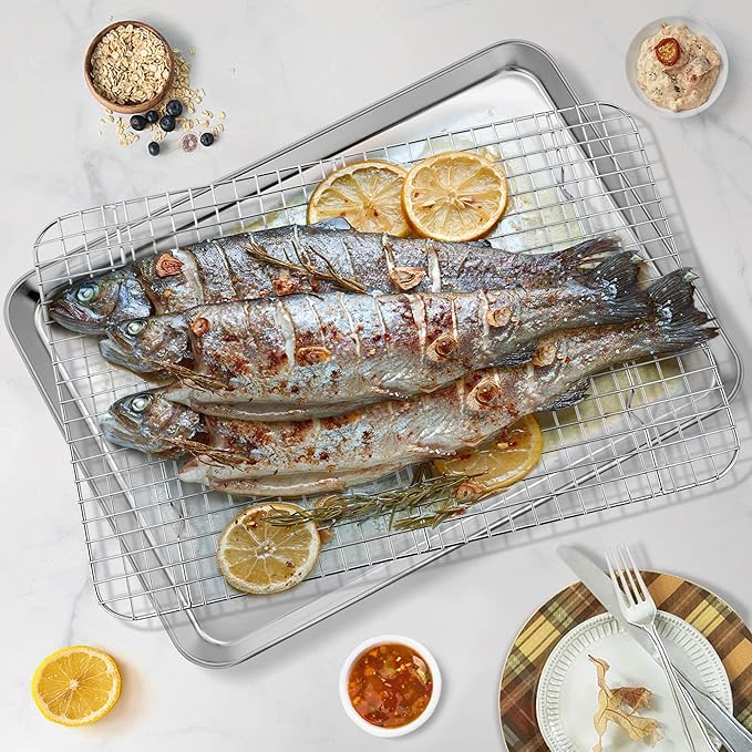 - 【NON-TOXIC & DURABLE】P&P CHEF half sheet and rack set is made of premium pure stainless steel without any chemical coating or other material, Neither releasing toxic material to food, nor reacting with your meal, Heavy-duty structure can hold heavier food and will be durable for years of use, A better choice than aluminium or coated pans and racks