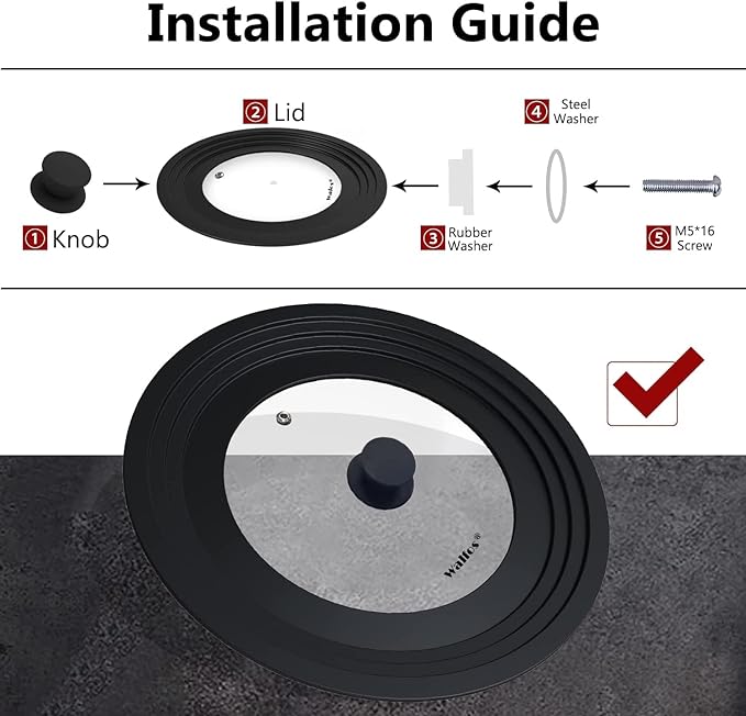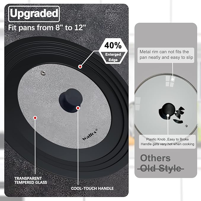 - Multi-Purpose: Walfos cookware and bakeware universal lids fits most pots, pans and skillets in your kitchen with diameters from 8 inch to 12 inch. Note: The lid not suitable for pots with two raised handles.