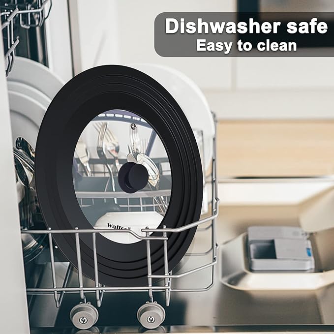 - Safety Food Grade Material: Walfos pan lid is made of premium tempered glass and 100% food grade silicone, BPA Free. The Glass lid helps you to say goodbye to metal rusting and the 450°F heat resistant silicone lid with non-slip silicone knob saves you from getting burning. Safe for microwave and dishwasher.
