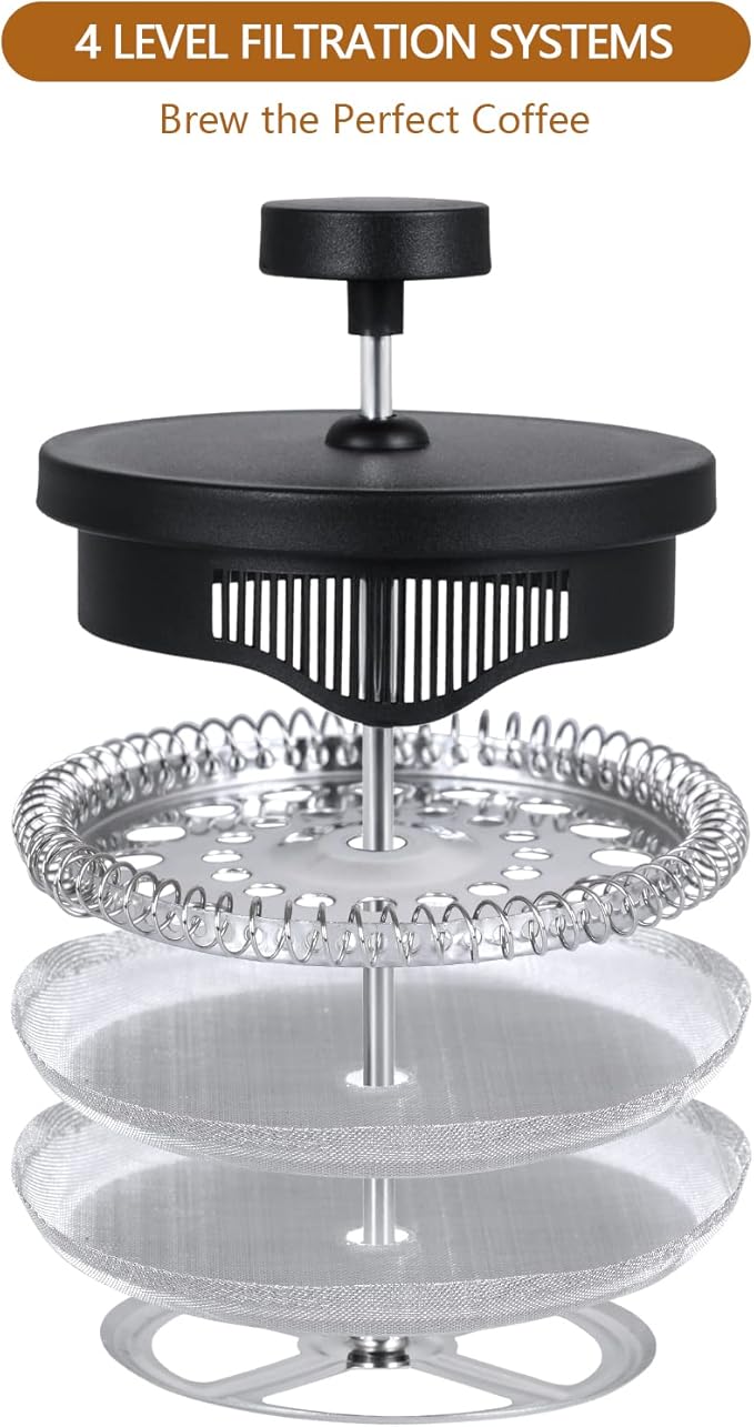 - 【4 Level Filtration Systems】 TBGENIUS French Press Coffee Maker features a 4 level filtration system to ensure that no coffee grounds get into your coffee, providing an incomparable delicious, smooth and full-flavored coffee.
