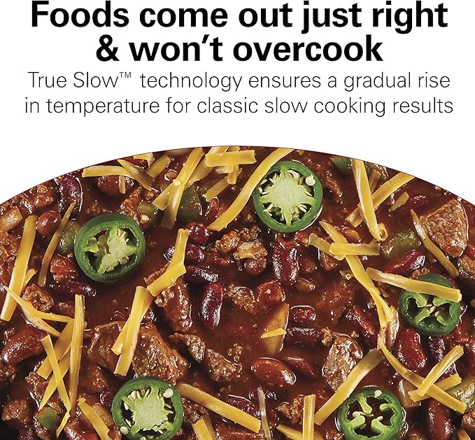 - FOODS COME OUT JUST RIGHT AND WON'T OVERCOOK: True Slow Cooker technology ensures a gradual rise in temperature for classic slow cooking results. Slow cook on your choice of low or high heat or use the temperature probe to cook food to a precise temperature.