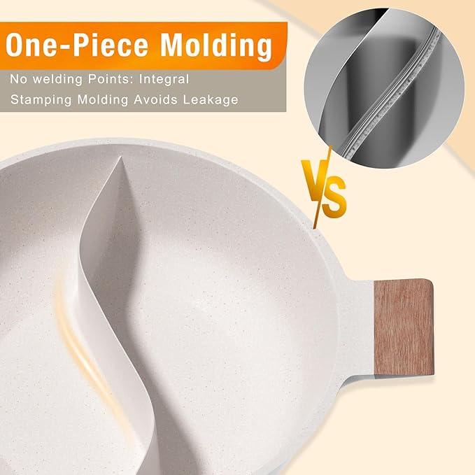 - Two Flavors at One Stockpot - The 100% PFOA FREE double flavor hot pot with divider ensures you enjoy both spicy and mild broth in one pot simultaneously, in accord with two different flavor demands. With its S-shaped seamless compartment, the shabu shabu hot pot also features with anti-overflow and anti-leakage.