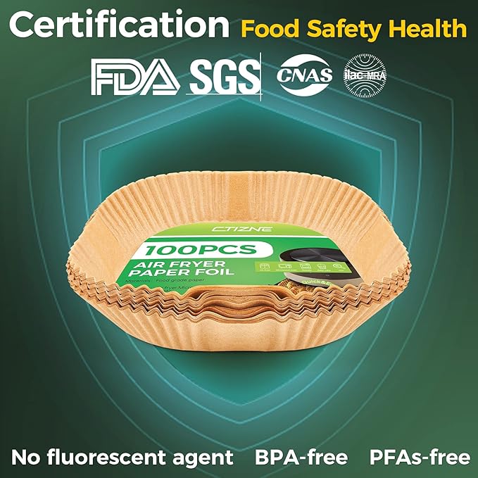 - Reliable Materials: Disposable air fryer paper liners are made of food grade parchment paper and silicone oil coating, unbleached and no fluorescent agent. Just take one out and put it in your air fryer when you are ready to cook