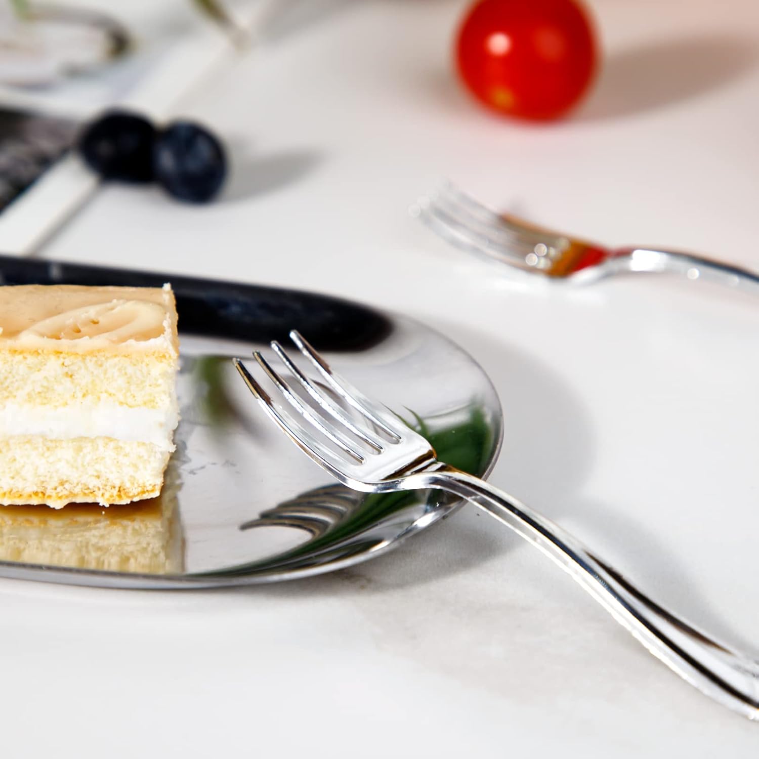 - ELEGANT DESIGN: WDF mini forks disposable plastic finished with sliver coating, our heavy duty plastic forks have that real sliver look, just like real silverware. Your guests won’t know the difference between these plastic forks and real mini forks.