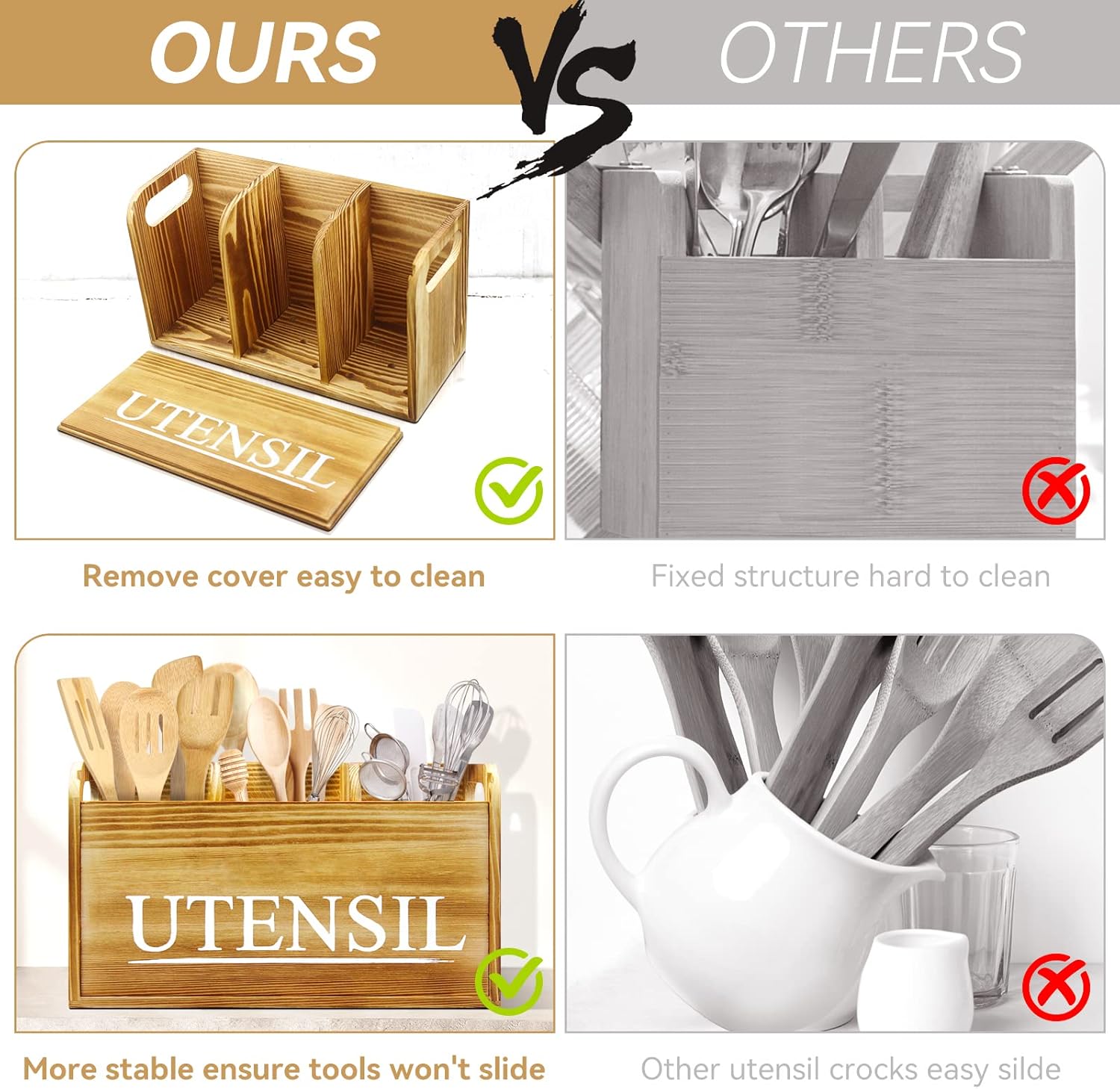- 💐【FARMHOUSE KITCHEN DECOR】This utensil holder is made from high quality, solid paulownia wood, will last a lifetime and the solid, goes with your farmhouse decor.Rid yourself and your kitchen of the daily clutter with this beautiful rustic. Make it the kitchen fashion leader in your neighbourhood.
