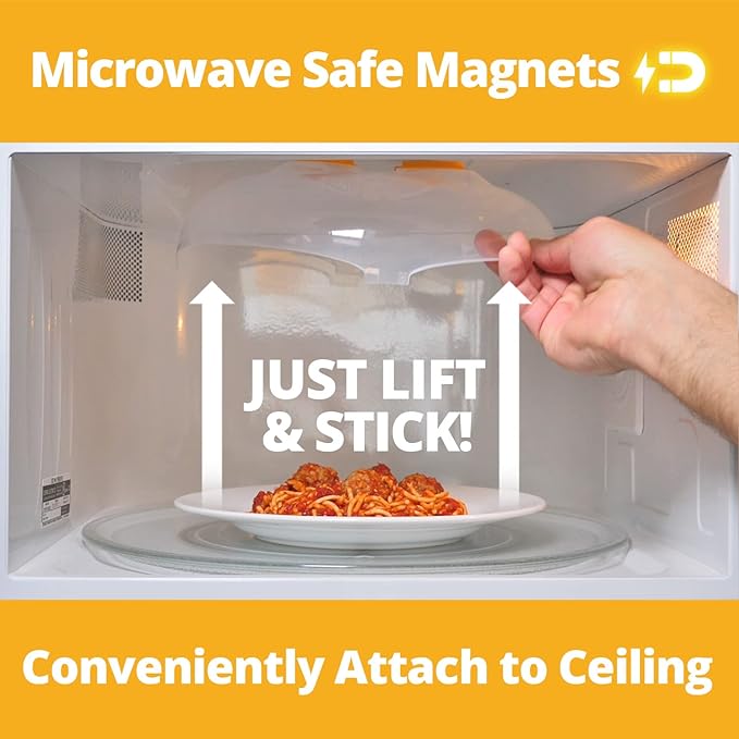 - SPLATTER PROTECTION FOR A SPOTLESS MICROWAVE: Avoid spills and splatters while reheating or cooking with our 12 X 11 in Magnetic Microwave Food Cover. It features built-in magnets for convenience, simply pull down the cover from the microwave ceiling whenever needed. Its easy-grip handle and steam vents allow for an effective, even food heating that's also mess-free.