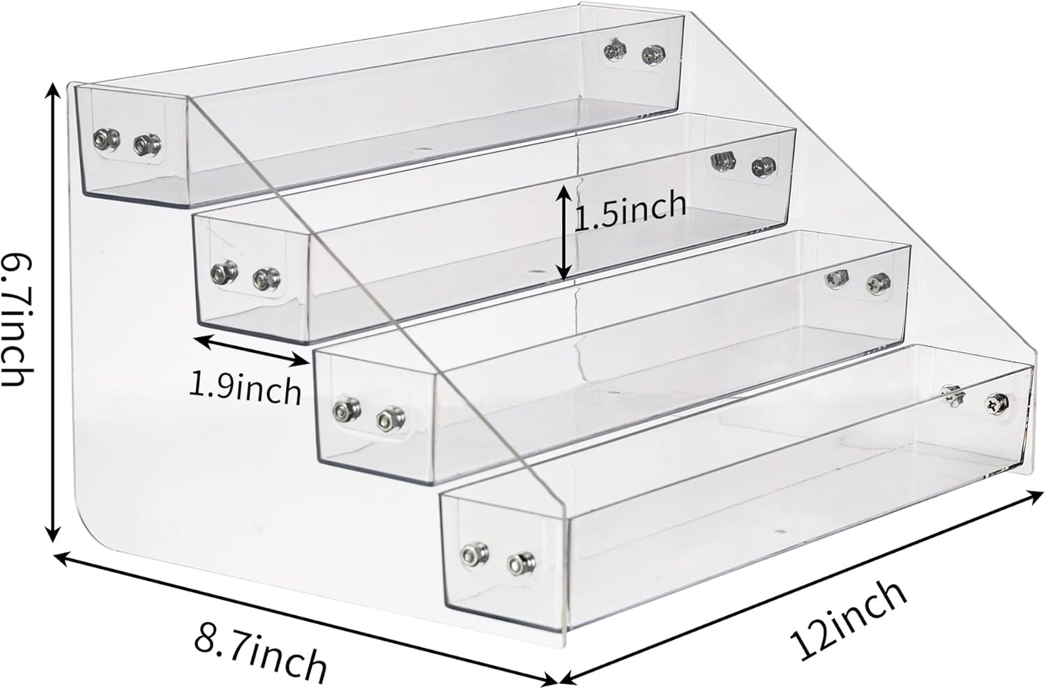 - 【About Size】 - The size of the acrylic spice rack is 12 L x 8.7 W x 6.7 H inches. It's worth noting that this product can only be used for condiments that are 1.9 inches or less in diameter, because the inside of the shelf is 1.9 inches wide.