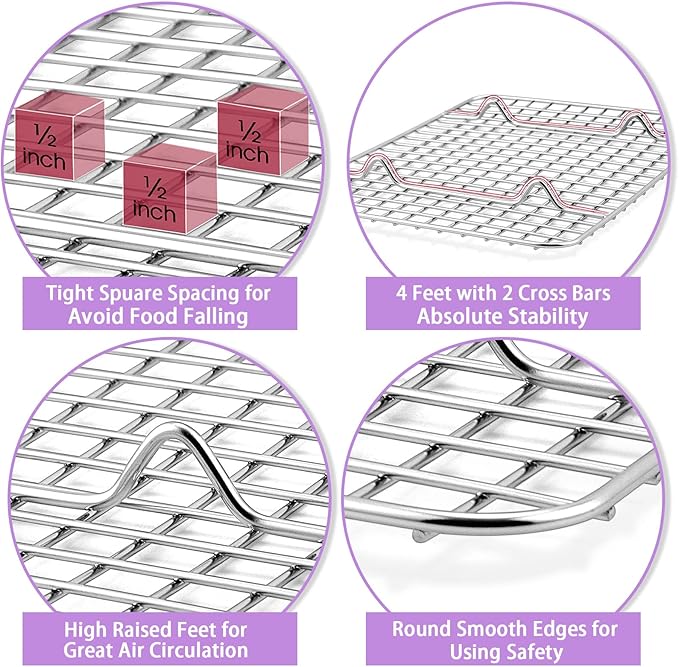 - 【Our Advantages】The corrugated bottom extend space under food, Allow more airs circulate around the food and the pan, Ensure quick and even heating, By the way, less contact surface between the bottom and food for less sticking risks, Each baking racks with ½” x ½” grid spacing can keep food from falling through, Solid construction with thick outer frame and cross bars, Ensure a great load-bearing and absolute stability