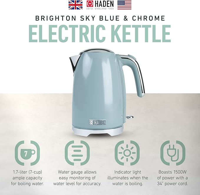 - Elegant Design: Inspired by England's seaside towns, the Haden Brighton Electric Kettle features a stylish finish with chrome accents, adding a touch of coastal elegance to your kitchen