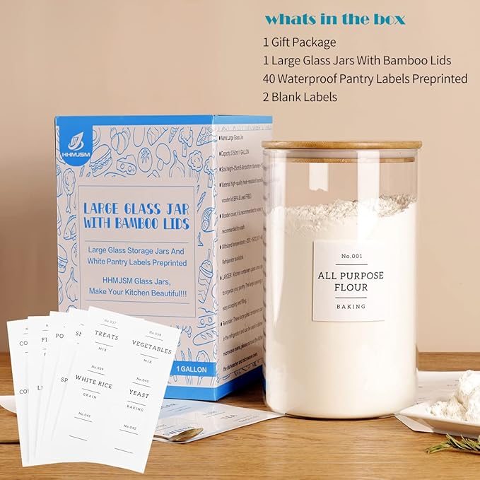 1 Gallon Large Glass Food Storage Containers With Airtight Bamboo Lid - Kitchen Glass Storage Jars Canister With 42 Pantry Labels - Thicken Big Clear Rice Containers For Your Pantry