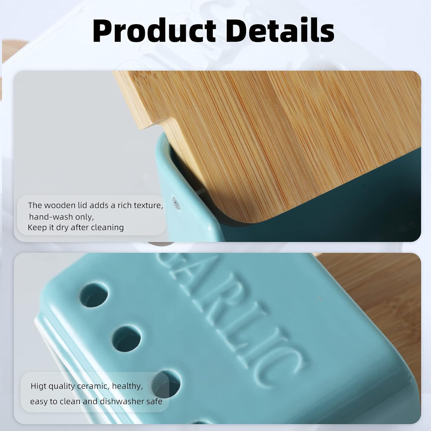 - CERAMIC MATERIAL : This Garlic Keeper is made of ceramic.The surface is smooth and translucent, which is easy to clean