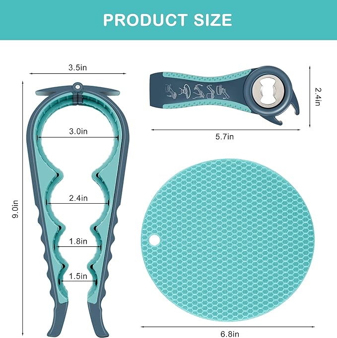 - Packaging information - You will receive a 4- in- 1 Jar opener, a 5-in-1 Bottle operer and Non Slip Jar Opener Gripper Pad, These tools can be easily stored or hung anywhere without regular maintenance, reusable and useful, It is an indispensable multifunctional kitchen tool in life, enough to meet your daily family needs; it can also be used as a great gift for parents, grandparents, girlfriends, other colleagues and friends.