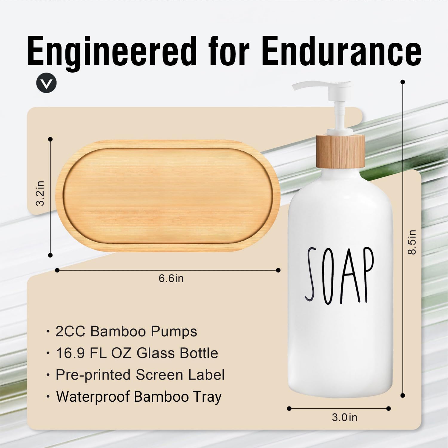 - EXCEPTIONAL QUALITY - The soap dispenser for bathroom is made of glass, matched with a bamboo pump and bamboo tray, will not rust, can be refilled, and is reliable.