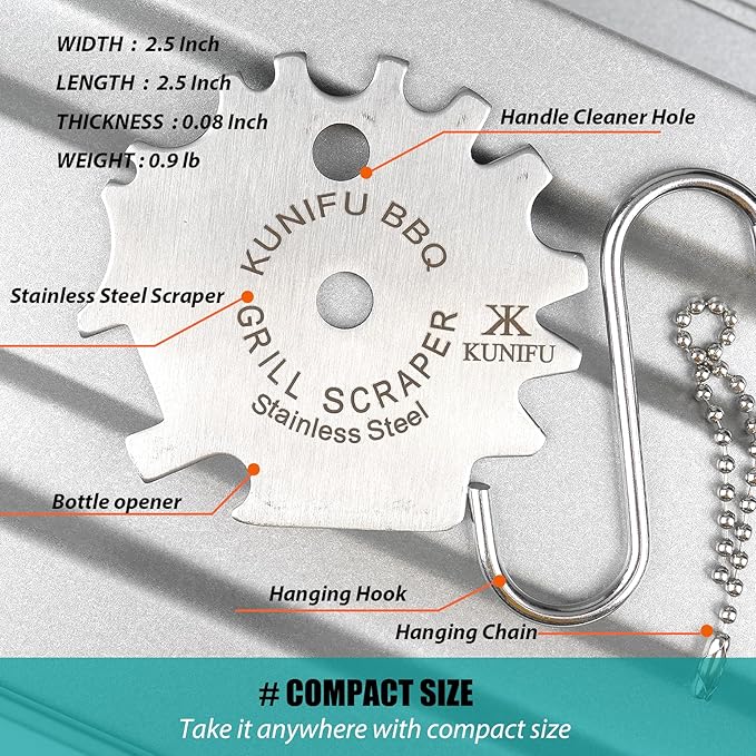 - Compact and Convenient - Come from gifts packages, includes Grate Grill Scraper, hanging hook and chain. Lightweight and portable, can be hooked with the keychain, or attached to the backpack when you go camping or hiking.