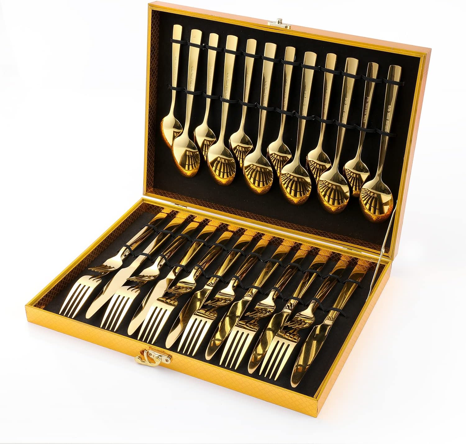 - ăGORGEOUS AND BEAUTIFUL APPEARANCEă: The high-grade mirror polishing process makes the surface of the knife and fork soft and smooth. This gold silverware set has good reflective properties, will shine with a golden glow to add brilliance to your dining table.