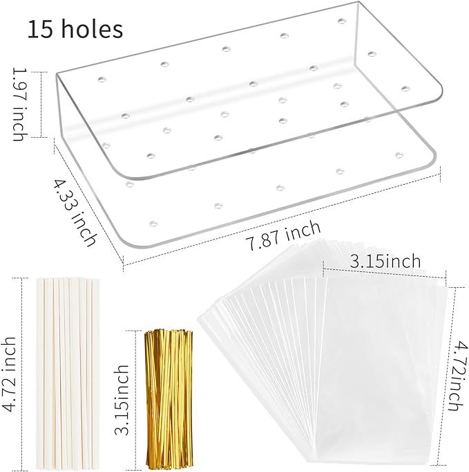- Excellent Value: Package includes 1pcs 15-hole acrylic lollipop holder, 1pcs 12 Cavity silicone cake pop mold, 50pcs candy bags, 50pcs paper sticks, 50pcs golden twist ties.