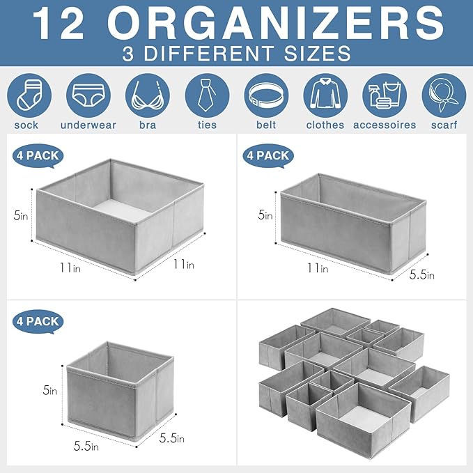 - 【PERFECT FIT WITH DRAWER】Featuring 12 pack dresser organizer, you can mix and match to make full use of your drawer storage space. It will include 4 Large square storage boxes (11"x11"x5"), 4 Medium container (11"x5.5"x5") and 4 Small bins (5.5"x5.5"x5).