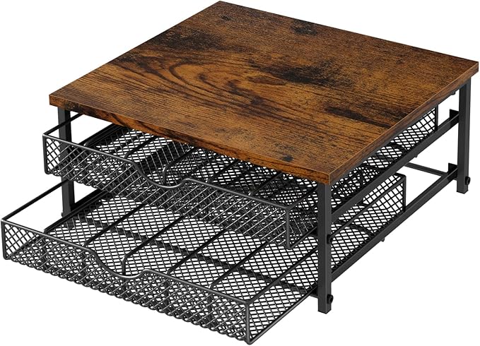 - Quality Materials: The pod storage drawer for k cups is made from a combination of solid metal and quality wood, sturdy and practical. The metal mesh basket keeps the aeration drying. The top wood board can place your coffee machine, is waterproof and easy to clean. It has excellent convenience and keeps your home clean and tidy.