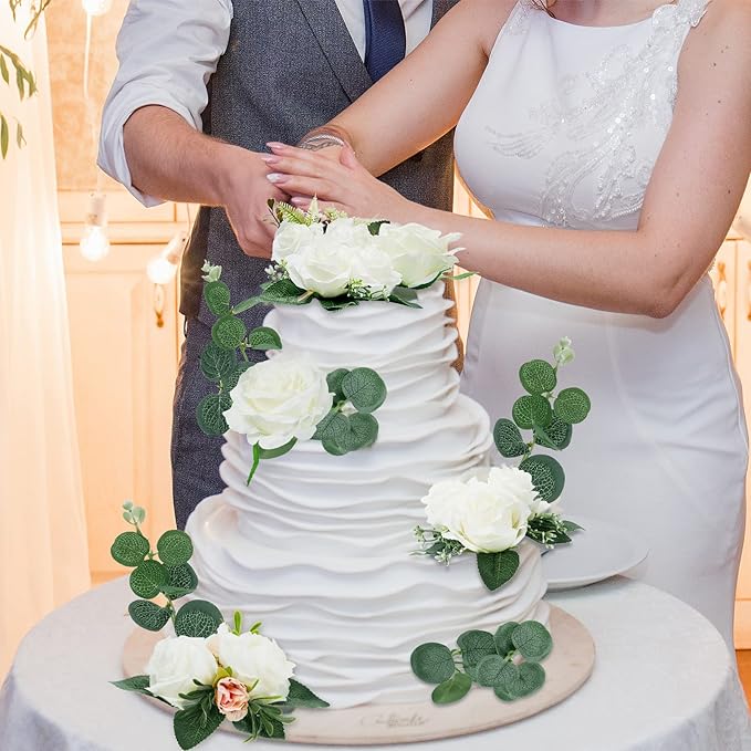 Taiyin 9 Pcs Flower Cake Topper Boho Cake Decorations Eucalyptus Flowers Floral Decorations for Women Wedding Birthday Party Anniversary(White)