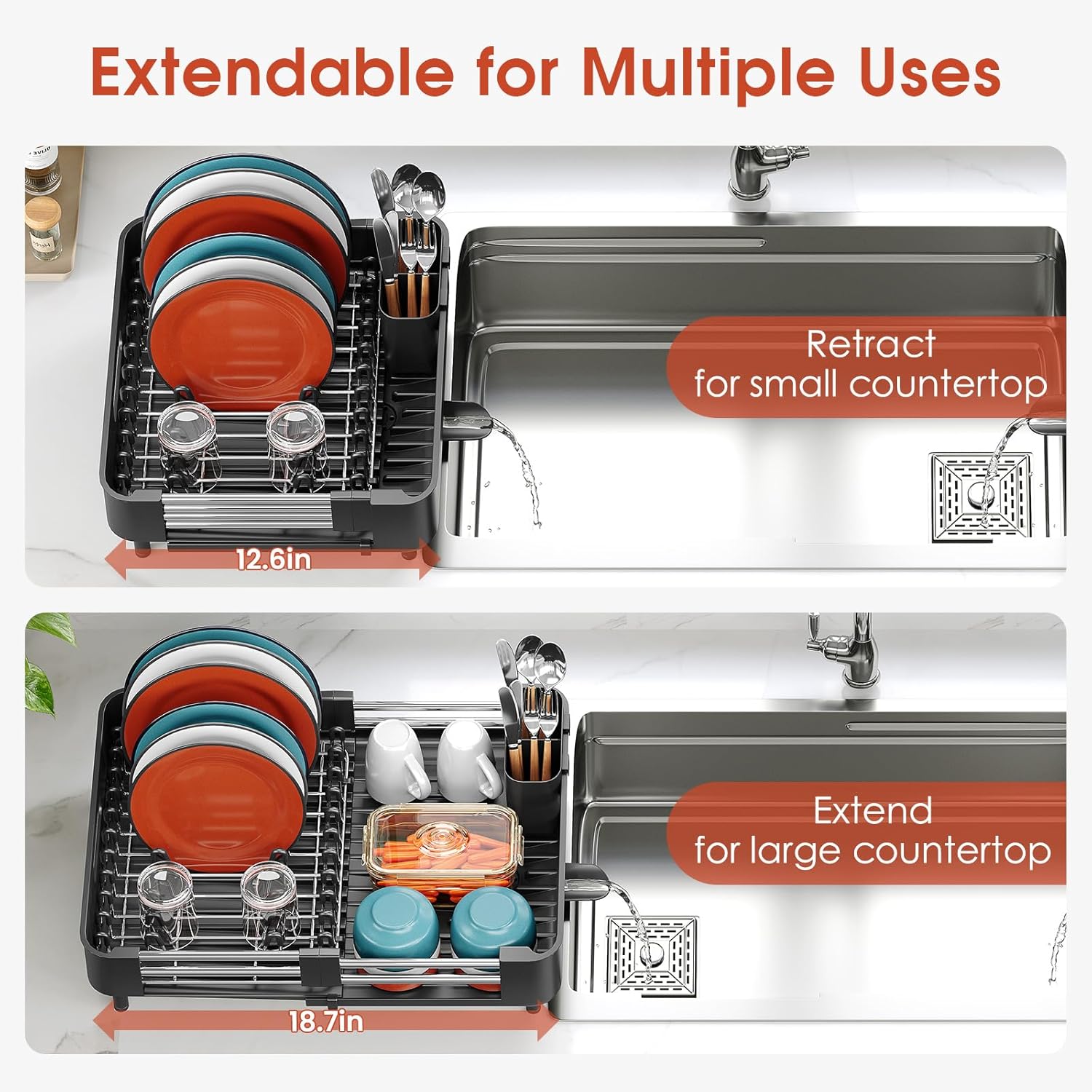 - EXTENDABLE DESIGN: The unit (not expanded) measures 12.6" L x 13.8" W x 4.84" H. The extendable design can expand to 18.7" length. It's perfect for all kinds of kitchen countertop space