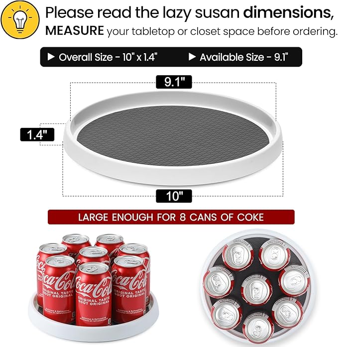 - [ Please Note ] - The lazy susan is large enough for 8 cans of coke (refer to the 2rd image). Please read the lazy susan dimensions and measure your tabletop or closet space before ordering in case it doesn't fit. Overall Size - 10" x 1.4". Available Size - 9.1"