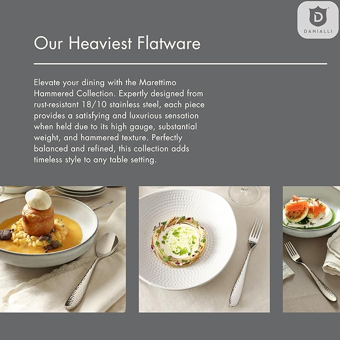 - Heaviest in DANIALLI's collection: Crafted with a hammered texture and heavy 18/10 stainless steel, each piece offers a solid well-balanced grip you’ll notice the moment you hold it.