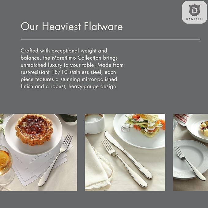- The heaviest in DANIALLI's collection: Crafted from solid 18/10 stainless steel, each piece delivers a well-balanced, substantial grip you’ll feel the moment you pick it up.