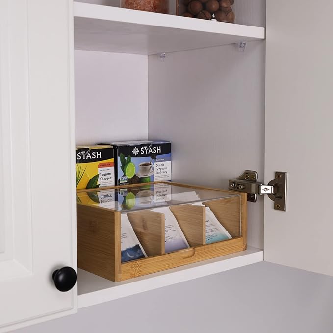HTB Tea Bag Organizer 6 Compartments Gift Box Bamboo Tea Organizer for Tea Bags with Acrylic Transparent Hinged Lid