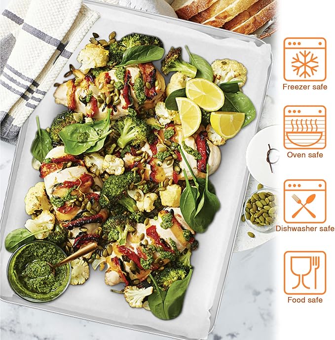 - 【2 PACK WITH 50 PARCHMENT PAPER】2 PCS baking sheets can be replaced easily, Great for broiling and roasting anything from layered sheet cake, pizza to vegetables, Comes with 50pcs grease-proof/water-proof food-grade parchment paper, No need to trim and sit perfect in the pan, Prevent sticking and easy release foods