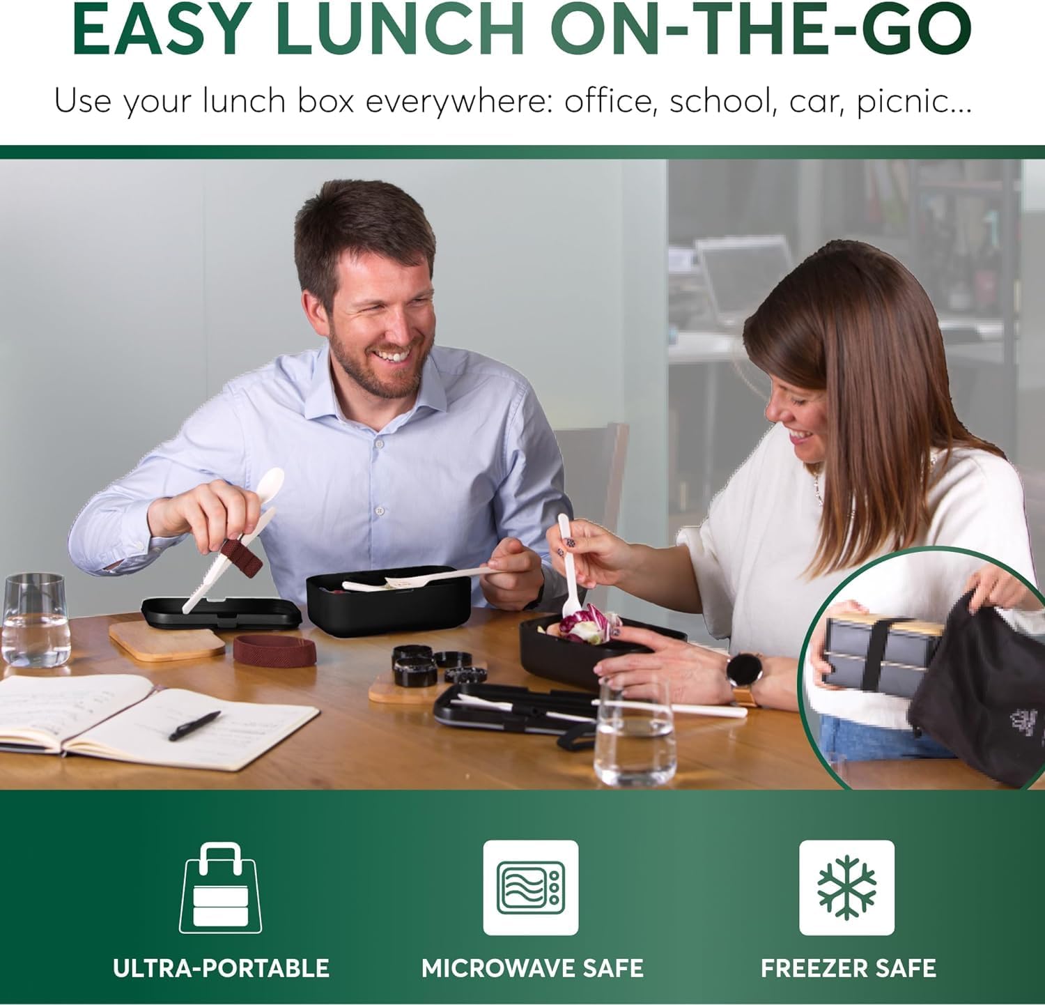 - TAKE ME ANYWHERE - It's really 100% leakproof: upside down, or shaken around, the silicone seal and the strap ensure no food or liquid ever spills from either layer of your adult bento box!