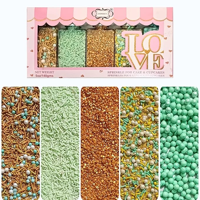 Confect Edible Sprinkles Mix Pack of 5 – Cool Summer Breeze Theme – Yellow Pearl Dragees, Mint Green & Gold Jimmies, Sparkling Gold Sugar – Cake & Cupcake Decorating Toppings - Vegan, Gluten-Free, Nut-Free, Soy-Free, Dairy-Free, Palm Oil-Free- 5 Oz