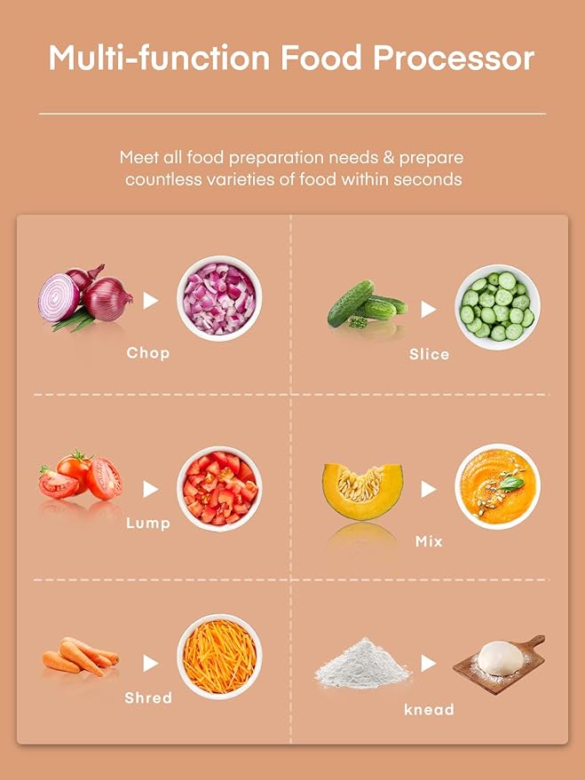 - Easy to Use - Simple controls, manual settings, and dishwasher-safe parts.The FOHERE Multifunctional Food Processor has up to 5 functions for perfect whisking, kneading, chopping, slicing, beating, pureeing, grating, rasping, mixing and cutting your way to dough and batters, burgers, fishcakes, salsa and more. Make enough to share. Quickly and easily blend larger batches