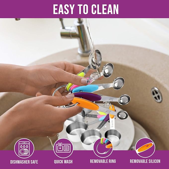 - EASY CARE: The stainless steel measuring cups and spoons set (10pcs) is dishwasher safe. The transparent plastic measuring cup is hand wash recommended.