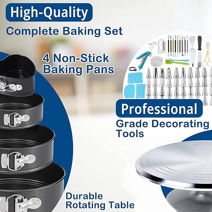 204 PCS Cake Decorating Kit, Aluminum Rotating Turntable Stand, Baking Supplies Kit Set with 4 Springform Pan Sets, 55 Icing Piping Nozzles, Cake Topper, Icing Spatula, Scraper, Pro Baking Tools