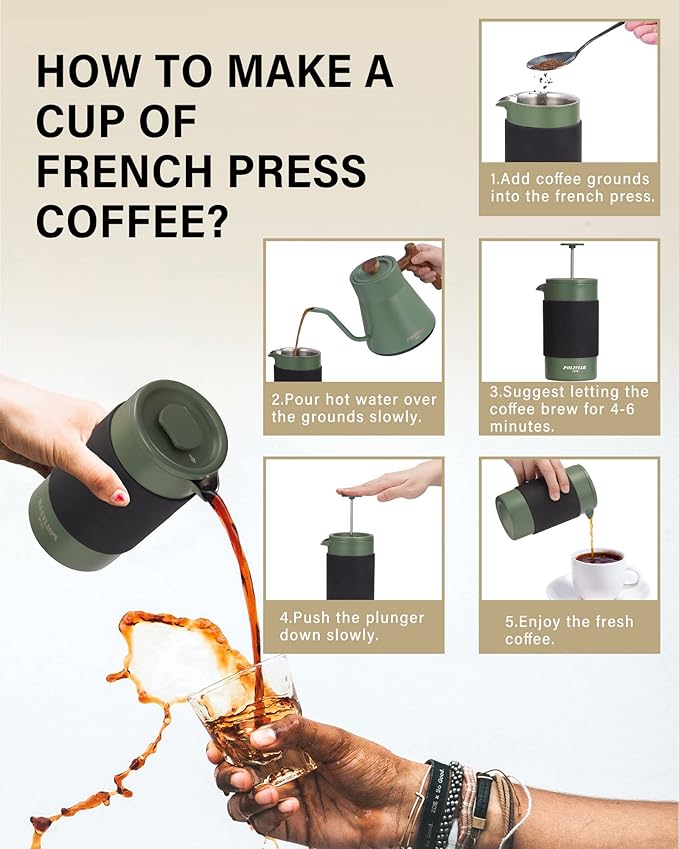 - PREMIUN QUALITY CRAFTSMANSHIP - POLIVIAR 12 OZ french press is made of 304 food grade stainless steel which is anti-rust and sturdy, taking care of user’s health and maintaining the pure taste of coffee without the metal taste when other pot does. With ergonomic designed handle,user can push and pull the plunger of coffee press easily. What is more, the travel french press with stylish long-lasting coating integrates beauty and practicality that it is a great gift idea for your friend, who is coffee lover.