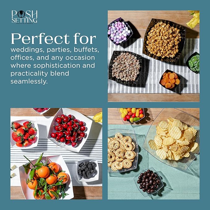 Posh Setting White Plastic Serving Bowls Disposable - Square Bowls - Square Candy Bowl - Plastic Snacks & Chip Bowls for Parties - White, Gold & Clear, Black Serving Dishes, 64 OZ, 4 Pack