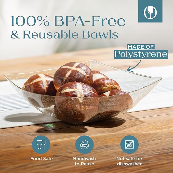 - DISPOSABLE OR REUSABLE: These thanksgiving plastic serving bowls offer great versatility—easy disposal or reuse. They are 100% reusable and can be hand-washed for multiple uses. This feature not only makes party cleanup a breeze but also supports responsible practices, giving you flexibility and convenience. Ideal for outdoor serving dishes, plastic bowls reusable, Gold Glitter bowls, candy jar, and acrylic bowls.