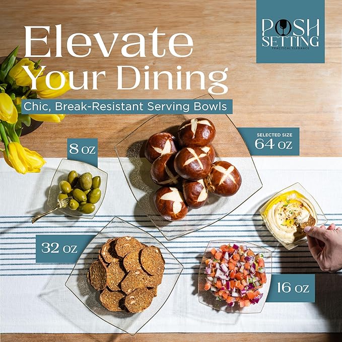 - MULTIPURPOSE USE: These 64 oz Gold Glitter plastic serving bowls are great for any occasion. Whether you're hosting a salad bar, serving snacks, candies, chips, or even using them for arts and crafts, these thanksgiving serving bowls meets all your needs. Enhance your party setup with these practical and stylish bowls that fit seamlessly into any event. Use them as candy dishes, chip bowls for parties, Gold Glitter plastic bowls, taco bar serving set for a party, and party bowls.