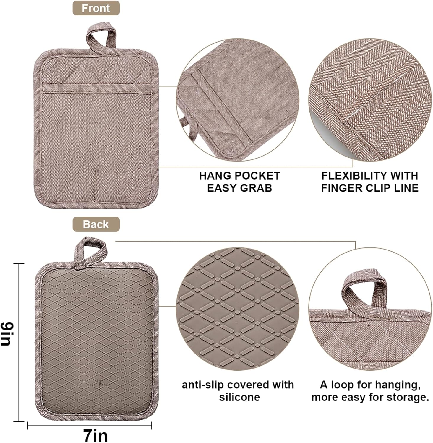 - 5. FINE WORKMANSHIP AND DURABLE USE: WORKMANSHIP QUALITY ASSURANCE: Strictly follow the sewing standard of 1-inch 8-9 stitches, which makes fabric and silicone perfectly, durable and smooth combination. Each pot holders will be tested 7 times by QC to make sure high quality.